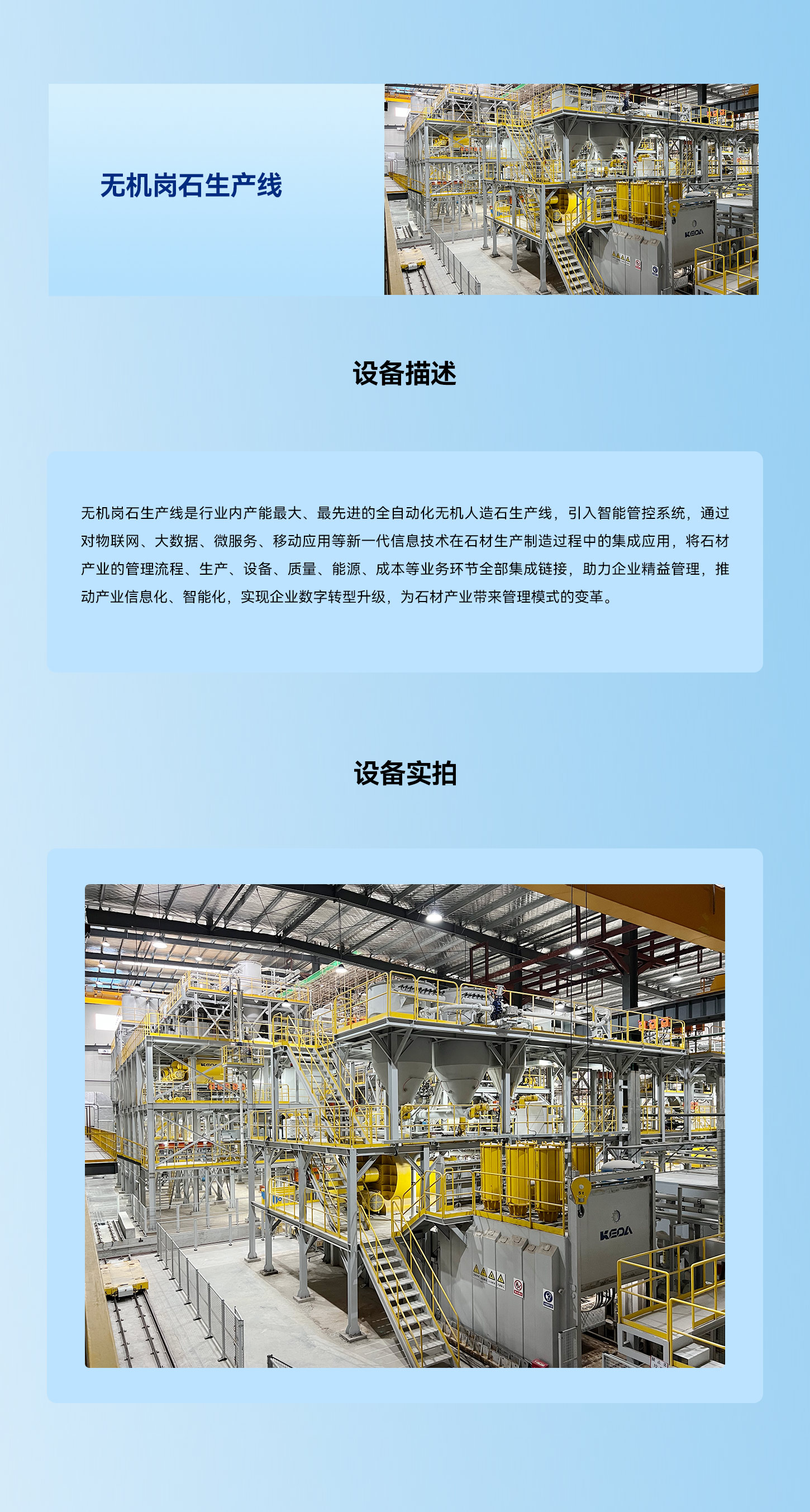 广西来宾无机岗石生产线是国内首条无机岗石全自动智能生产线,核心亮点为引入科达制造成熟的智能管控系统。该系统结合石材特性深度开发,集成物联网、大数据、云计算等新一代信息技术,打通管理流程、生产、设备、质量、能源、成本等全业务链,实现精益管理,驱动企业信息化、智能化转型与管理变革,引领行业升级,并夯实海外市场拓展基础。
