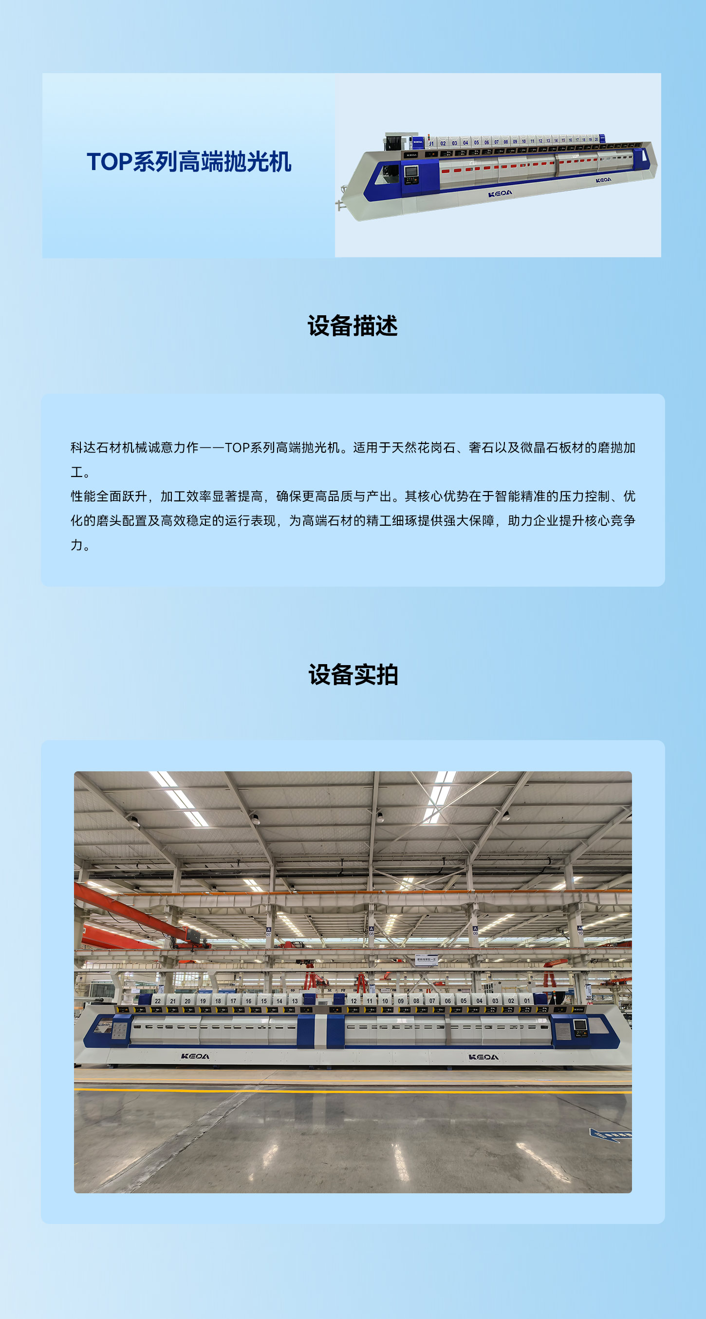 科达石材机械诚意力作——TOP系列高端抛光机。适用于天然花岗石、奢石以及微晶石板材的磨抛加工。 性能全面跃升,加工效率显著提高,确保更高品质与产出。其核心优势在于智能精准的压力控制、优化的磨头配置及高效稳定的运行表现,为高端石材的精工细琢提供强大保障,助力企业提升核心竞争力。