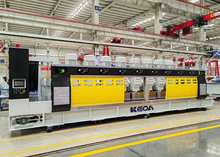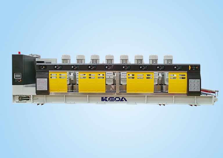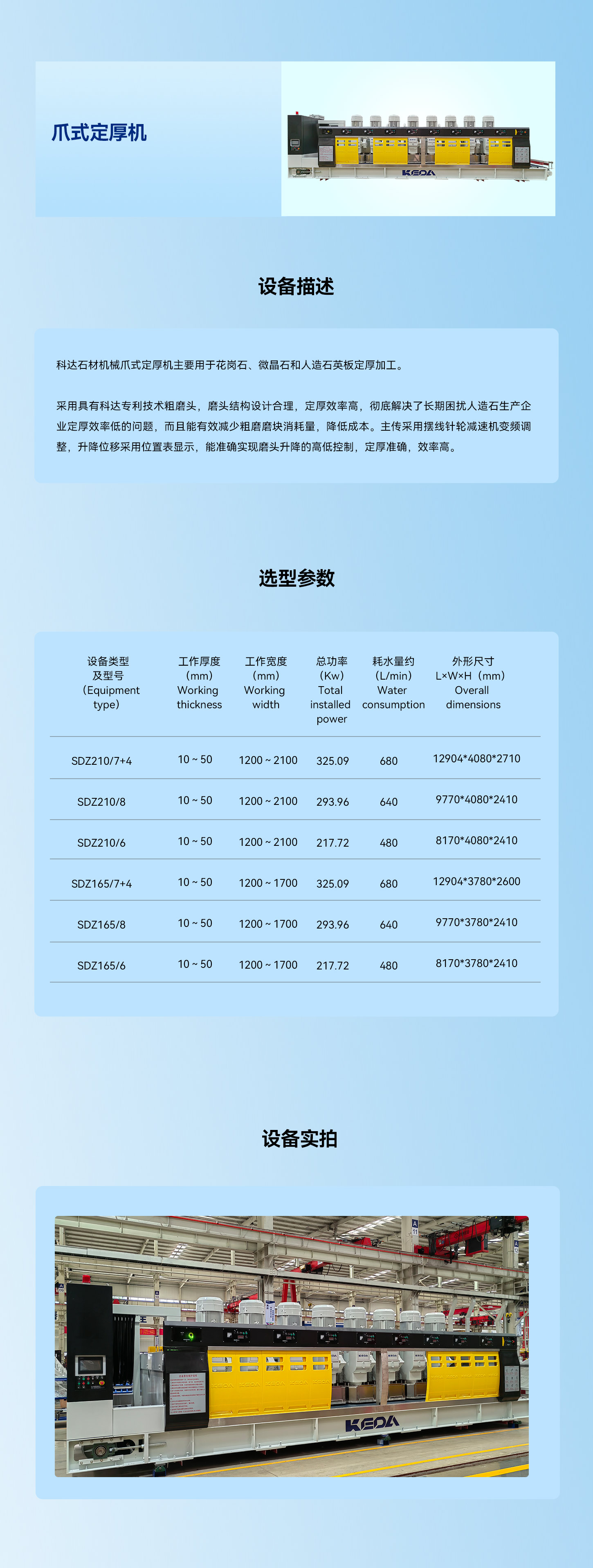 1. 科达公司在 2007 年底国内首家推出的高科技产品,主要用于花岗石、微晶石和人造石英板定厚加工。 2. 采用具有科达专利技术粗磨头,磨头结构设计合理,定厚效率高,彻底解决了长期困扰人造石生产企业定厚效率低的问题,而且能有效减少粗磨磨块消耗量,降低成本。 3. 主传采用摆线针轮减速机变频调整,升降位移采用位置表显示,能准确实现磨头升降的高低控制,定厚准确,效率高。