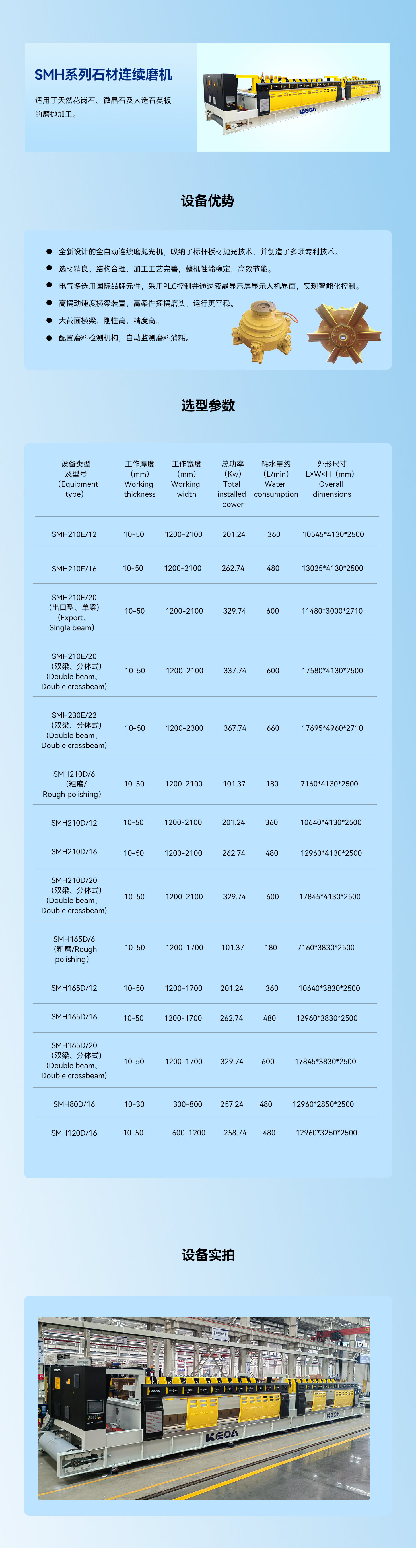 荣获国家技术革新一等奖产品; 适用于人造石英板、奢石、天然花岗石及微晶石的磨抛加工